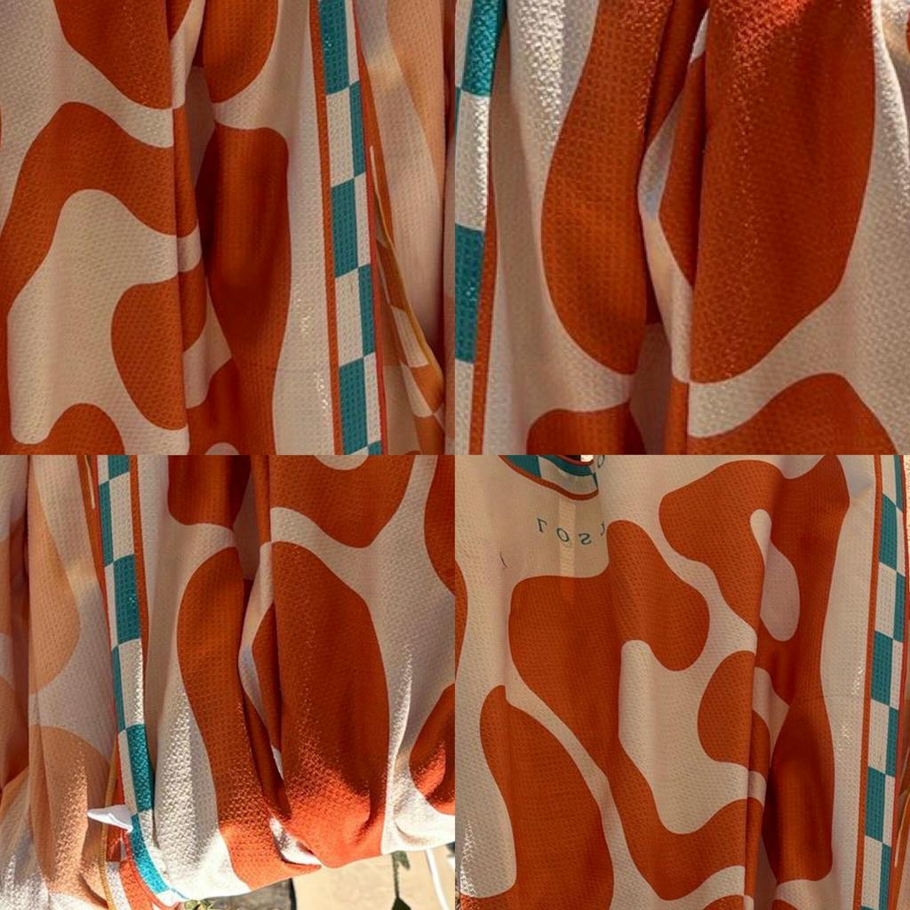 Hangs like a sarong and love the abstract wording pattern and edges. Shirt, hat, book and my Sol- I’m set.